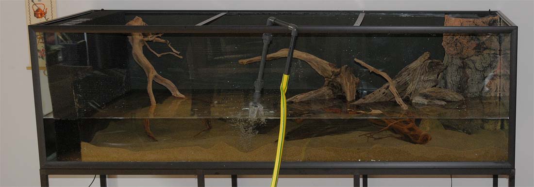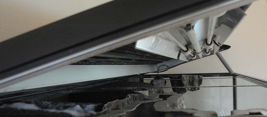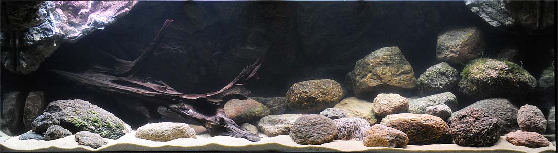 From planted community tank to a Rocky coast setupPreparing the tank In the previous setup, a Back-to-Nature module was glued in, placed in the right hand corner. I have opted for a full artificial background, so this module has to go. The module was glued to the glass, using silicone, and had to be cut free, using a hobby knife for the first couple of cuts and a salmon filet knife, which is really good at this, because of the flexible blade, for the rest. The flexible blade makes it relatively easy to keep the blade very close to the glass, leaving only a little glue. It is advisable to use extreme care, when the blade is close to the seams of the tank!![]() The mentioned module is clearly shown here. Preparing the lamp The lamp is originally equipped with armatures for 2 x double 39W T5 tubes, but was modified to hold 4 x 39W, in order to provide sufficient light for the plants in the previous setup. ![]() The lamp with the extra armatures mounted. This extra light is no longer needed, in fact there really is no room for it, with the projected background mounted, so the extra armatures must be removed again. ![]() The lamp is shown on the tank, with the background mounted. As evident, the extra tubes used in the previous setup, would send a good deal of their light right down into the filter, and the rest would put way too much light on the background, detracting from the desired effect. |