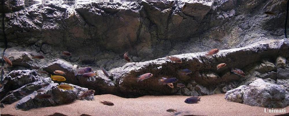 thing does not end up looking like a stone fence! In order to achieve this, I have chosen to use a dark granite , with a fairly rough surface. It has a fair resemblance to the background, which makes for a natural look. In addition to the rocks, I have used a large root, which is app. 1/3 of the total length of the tank. It is all arranged, to form a curved line through the tank, following the "shelf" built into the background (which is the primary reason why I chose this model). It is a Mbuna tank, so I do not have to consider any special needs regarding free bottom area, which I have taken advantage of, to cover almost all of the available area with rocks of different sizes in multiple layers. This should provide a maximum of territories, with the resulting full-coloured males. It also gives a decoration with a natural fall of the rocks, compared to the stacked heaps often seen in this kind of setup. And now We are ready for all the fishies! |