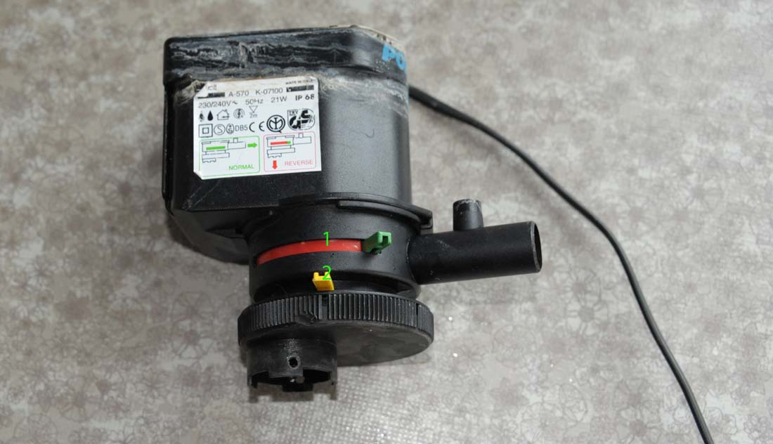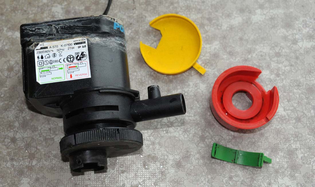 full red of full green position! there is no middle way. 2: Flow regulation. This knob simply closes the inlet gradually, and thus regulates the throughput. These levers are not needed here, as the pumps should run on full strength the normal way. Actually they are only a possible source of failure, since they could be accidentally pushed into a wrong setting, when the pumps are maneuvered into the rather cramped spaces they should go, so it could prove beneficial to dismantle the pump and remove the yellow part: |