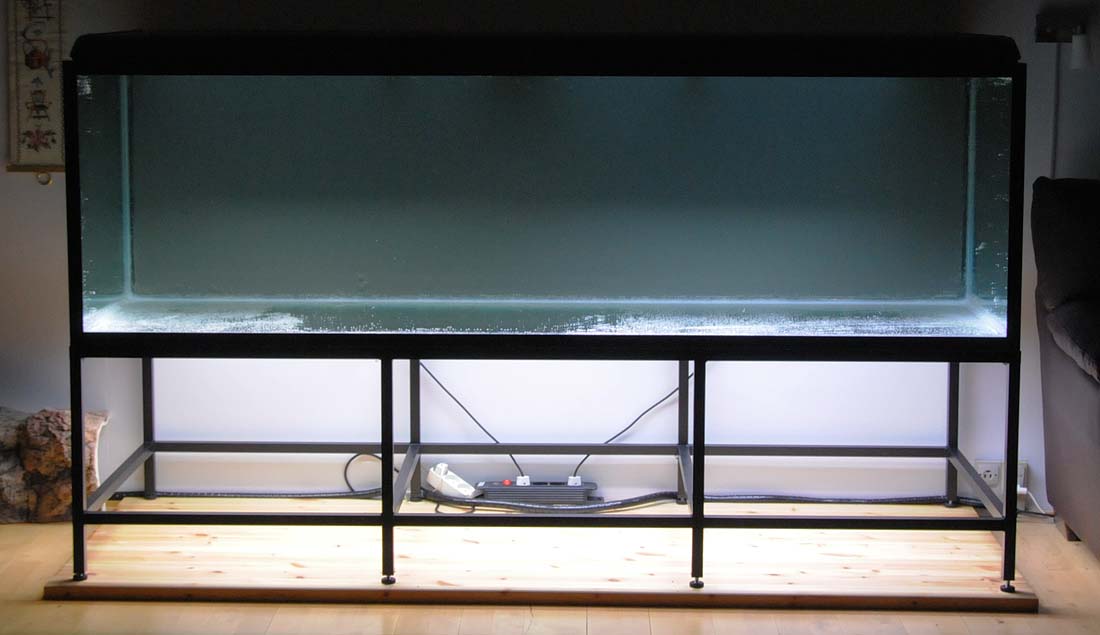 A little info about the used tank, technical installations, choice of materials and decoration. The tank to be used, is a 900 liter Akvastabil Effectline, with a black anodized aluminum frame. the stand is a matching standard aluminum construction, cut down to a height of 47cm (+ the height of the adjustment screws). The Lamp is the matching Effectlight lamp. ![]() The tank, stand and lamp. The setup is placed on a 27 mm oiled pine tree plate It was acquired August 2010, and was originally used as a community tank, for South American fish, as shown below. ![]() The original setup |