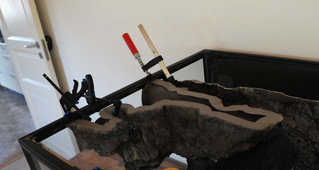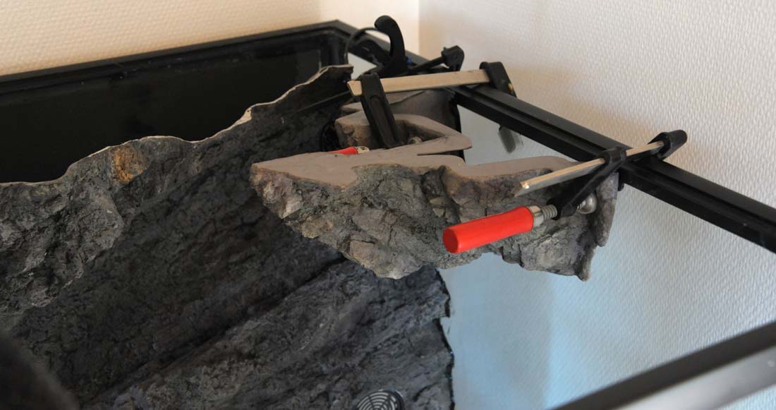 Mounting the background I have decided to try out one of the highly acclaimed background filters. Everybody with any experience from using them, seems to have only positive things to say, and I got a very convincing demonstration from the dealer (Unimati in Randers) who sold Me a complete background/ filter material package. The very handsome background, a RockZolid Papua, measuring 198x58 cm, is heavier than water (made from some kind of glass fiber, I think), so it could just be pushed in place, but since it is going to be used as a background filter, it must be glued in, to make it watertight. Full backgrounds often require that the metal bar holding the front- and back glass together, is removed, but in this 900L tank has more width than height, so it is possible to push the background into the tank lying down and subsequently raise it to upright position inside, so this was not necessary here. ![]() A tank with the mentioned background (and two matching modules on the bottom). The image is taken from www.Unimati.biz, with full permission. The dealers instruction for mounting (in Danish, but with excellent illustrations) More about the background The background was a little bit too long, so it had to be shortened by app. ½ inch. The best tool for that is an angle grinder. A jigsaw CAN be used, but the glass fiber does have a tendency to splinter, Generally speaking, it is worth considering that the background is fairly fragile, and that especially the corners may break off, if not handled carefully. Using the angle grinder is however, very simple and safe, but protective eyewear is recommended! Also some form of clothing to protect hand/arms is good, as the fine dust from the cutting contains splinters, that stings and itched for a long time, if it settles on the skin. Holes for in- and outlets are drilled and grids are glued in at the inlets, which in this case is 60 mm wide. If desired, a notch can be cut off at the top corner at the inlet-end, to create an overflow inlet. Also remember to cut the bottom corners, to avoid damaging the silicone sealants of the tank!