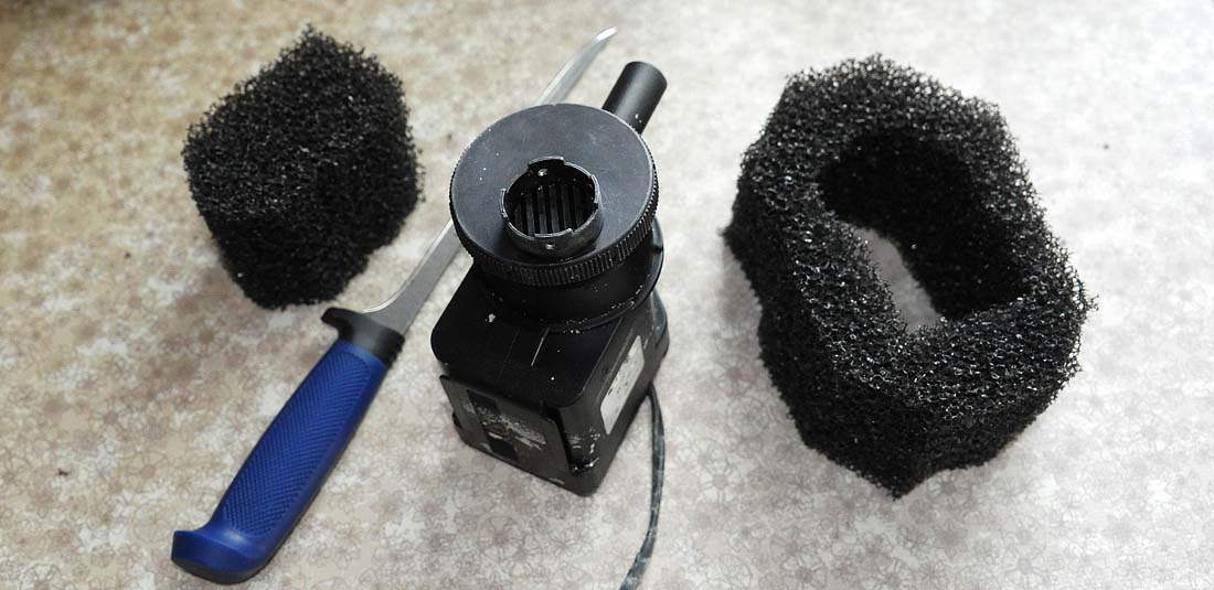 ![]() The "belt" is cut from a block of biofoam. It is important, to make sure that it is made thick enough to reach out over the dimensions of the parts not covered, so that the pump can be wedged in place without any part touching a hard surface. The foam belt also helps keeping the pump in place, as the friction between the foam wall and the belt keeps it fixated. |